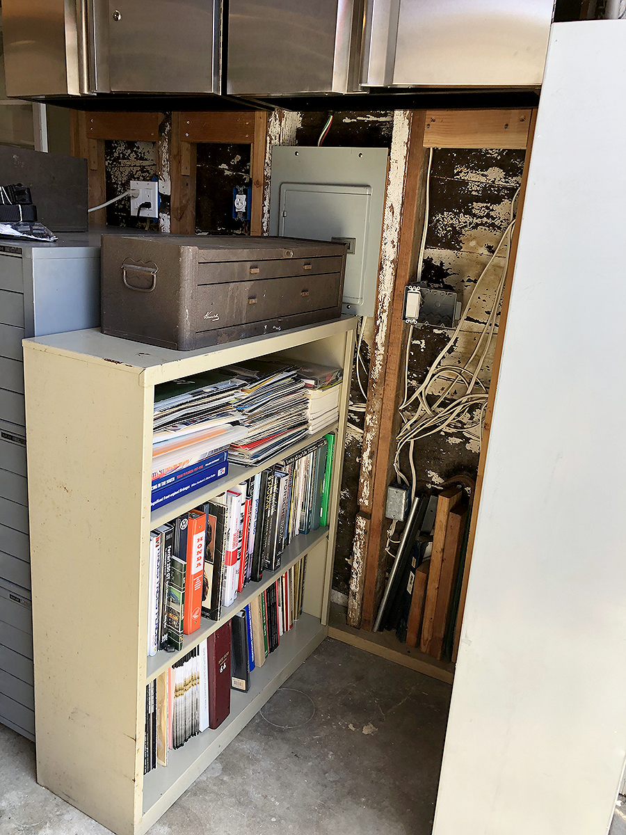 | This tall & narrow book case can move a little more away from the wall because the garage door behind it is the one that's used the least and doesn't really need to be accessible. |