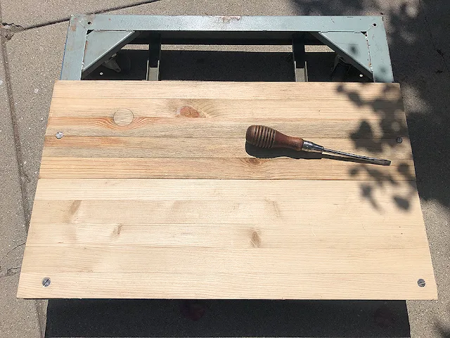 | I have a couple of these low metal rolling platforms. One is currently being used to store the drafting table outside. This second one will be used to store some bins with stuff in it. But, before I can put the bins on it, I need to put a "floor" on it. I have some 1/2" thick wood from IKEA that I'll cut to size and screw to the rolling base. Using a circular saw (on my folding Stanley work bench), I cut three pieces of wood to size & drilled holes to match some existing holes in the corners of the base. I tapered the holes so that I can use some flush fitting screws. The first piece of wood has been located on the base in this picture. |