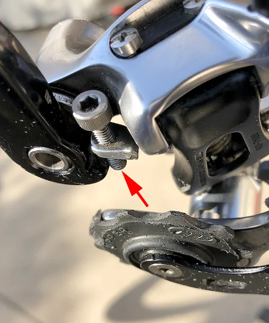 The red arrow points to a stop screw that is not sitting on the derailleur hanger tab that it's supposed to be sitting on... Misaligned...